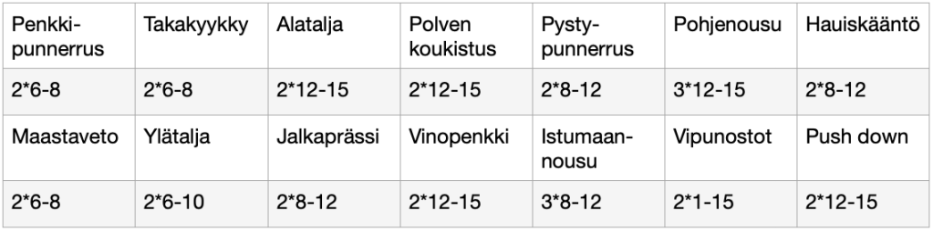 - Täydennä treenivolyymia eristävämmillä liikkeillä, kuten lantionnostoilla ja polven koukistuksilla